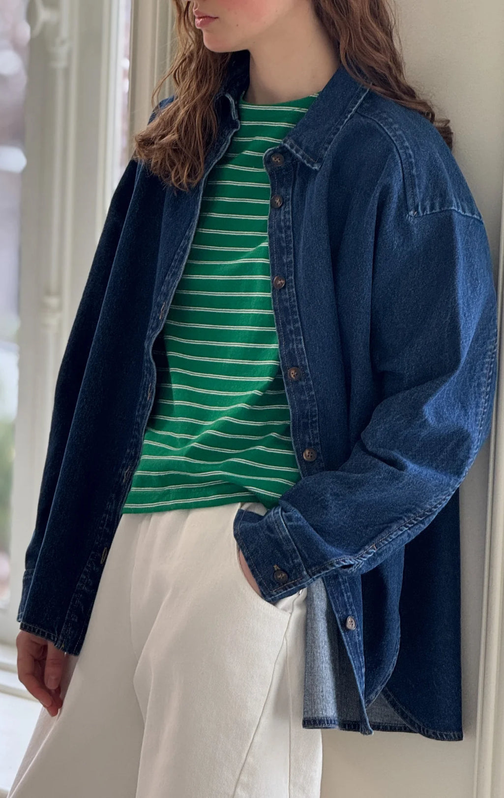 The classic denim shirt, reimagined. It fits like the perfect vintage '90s piece—slightly oversized and relaxed for easy layering, or wear it as a lightweight jacket. Made from 100% heavy cotton denim, it's soft yet durable, ideal for both casual and elevated looks. Featuring functional buttons, contrast stitching, and a classic rounded hem, it's a timeless, versatile wardrobe essential that transcends time.